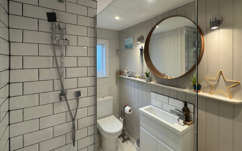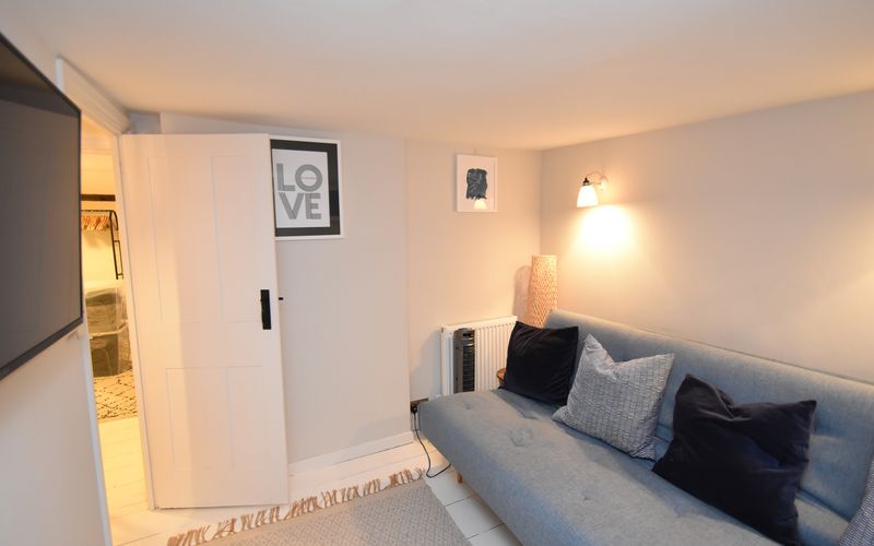 Stairs lead to the first floor where you’ll find a comfortable double bedroom alongside a sleek, modern shower room with a large walk-in shower. A further staircase takes you to the second floor, home to a twin bedroom and an additional TV room, ideal as a snug for children or a quiet reading space.