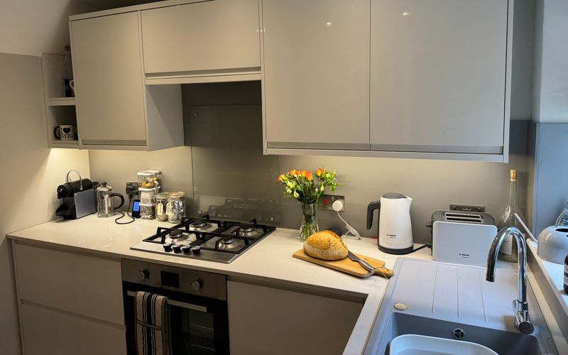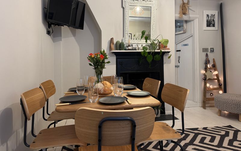 Enter straight into the well-equipped kitchen, thoughtfully designed for relaxed self-catering stays, complete with a coffee machine and washer/dryer. From here, the cottage opens into a cosy lounge/diner featuring original character details and a flat-screen Smart TV — the perfect space to unwind after a day exploring the town.